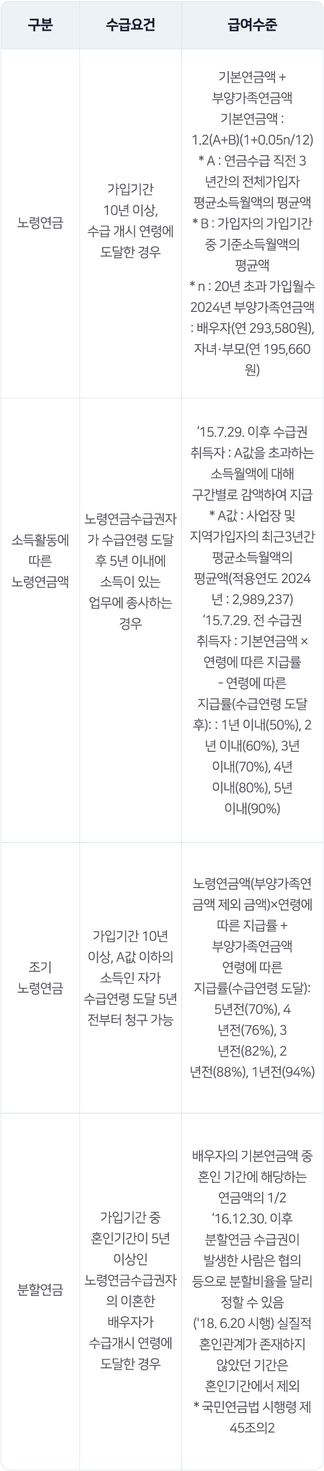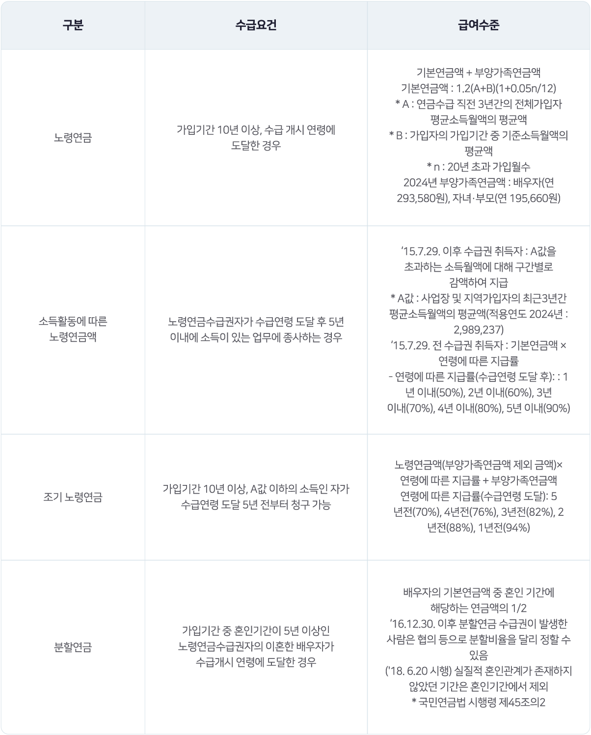 연금급여(매월 지급): 노령연금, 분할연금, 장애연금(1∼3급), 유족연금